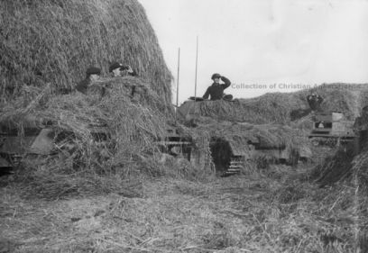 Germany had camouflage nettings and camouflage tarpaulins but did not generally use them for vehicle camouflage. Instead, small rings were welded to the sides, to which foliage could be attached using wire. During the late-war years, large piles of pre-cut branches were sometimes left at roadsides, to allow retreating units to quickly camouflage their vehicles.