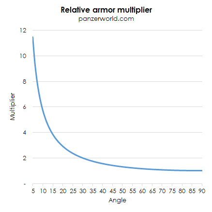 As the angle decrease, the relative armor thickness increase significantly. Thus, while an angle of 20 degrees will only increase the relative armor thickness by about seven percent, an angle of 30 degrees will increase the relative armor thickness by about 36 percent.