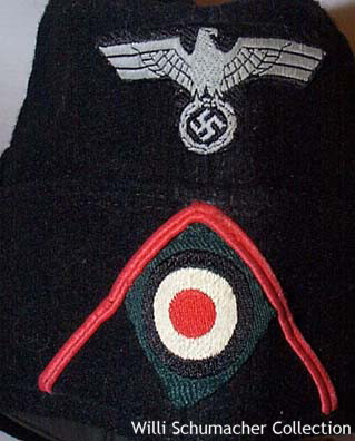 By order HM 40, No. 429, dated 27 March 1940, two new field caps for panzer troops were introduced, the gray-green field caps being expressly forbidden to be worn by panzer crews in their black panzer uniforms. For NCOs and other ranks was a black wool cap in the same style as the M1934 field cap and for officers one in the style of the M1938. Enlisted men were also issued black panzer field caps in the M1942 style, however, the vast majority were in the M1934 style. The M1934 styled cap had a center seam which opened the top of the cap to resemble an M1943 field cap without a visor. It was not permitted to tack the two sides of the top together. The cap tapered down on the back. The turn up was designed to be pulled down over the ears during cold weather. The top front had a tendency to billow out above the front of the turn up. There were two metal grommet ventilation holes, one on each side. The officers wore the M1938 model field cap which had only minor differences from that of the M1934, the primary being the cap didn't open up on the top. Officers wore aluminum wire piping around the crown of the cap and along the top edge of the scalloped front of the turn up. General officers wore gilt aluminum wire piping. Insignia for NCOs and other ranks consisted of a woven national emblem using white thread (later changed to silver-gray) on black backing. Both officers and enlisted wore the cockade in woven tri-color thread (the white being changed later to silver-gray) on a black diamond backing. Some officers preferred the cockade manufactured in aluminum wire or silver bullion. Officer's national emblems were woven in aluminum wire and general's in gilt aluminum wire. Officers and generals had the option of wearing all bullion insignia; officers in silver and generals in gold. Soutaches, piping material formed in an inverted "V", in pink were generally worn over the cockade, however, other colors, such as golden-yellow for panzer reconnaissanceI 1I.The 24. Panzer Division, who commemorated the fact that they used to be the 1. Kavallerie Division and the only one to convert to a panzer division also wore the distinctive golden-yellow piping on their cap soutache, around their tunic collars and around their Totenkopf collar tabs., lemon-yellow for panzer signals, and alternating black and white (black and silver for officers) for Panzer Pioniere companies.